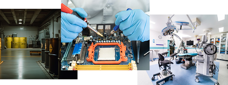Work places such as chemical plants, engineering and machine workshops, factories for electronic components, hospitals and other medical facilities, power stations, data centers, carpenter workshops and furniture factories, repair shops, hazardous waste management facilities and other ATEX related spaces etc. needs to be protected for ESD/ATEX. Some of these spaces, like ATEX related spaces and hospitals, have regulation and standards to fullfil.